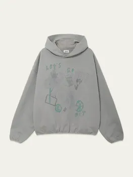 капюшон, скрытые карманы. Манжеты и низ на резинке. На груди размещён принт